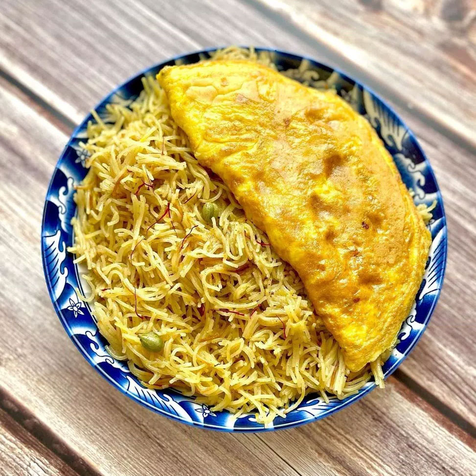 Spiced basmati rice with braised chicken, cardamom, cloves, and raisins. Garnished with toasted almonds and parsley. Tomato chili sauce on the side