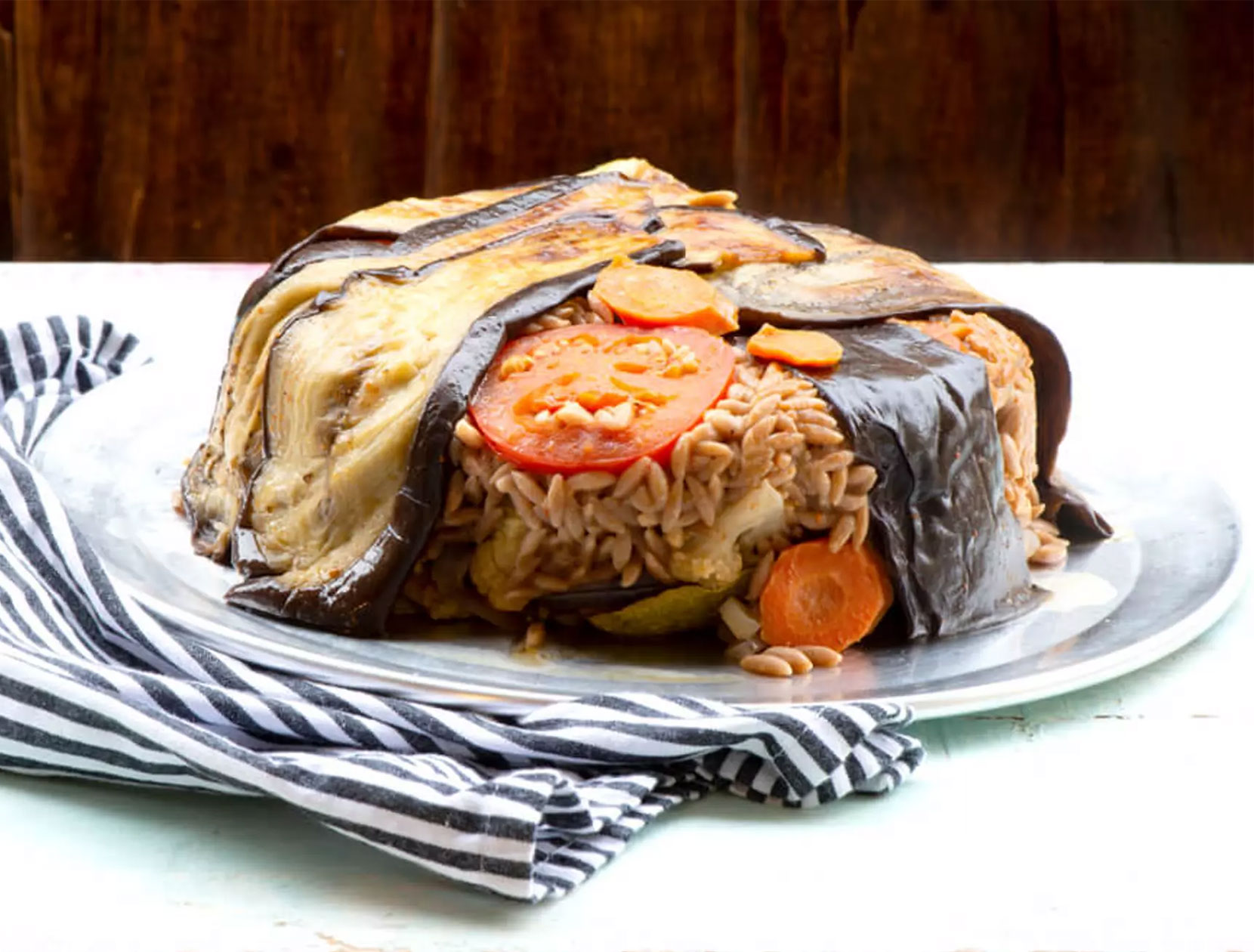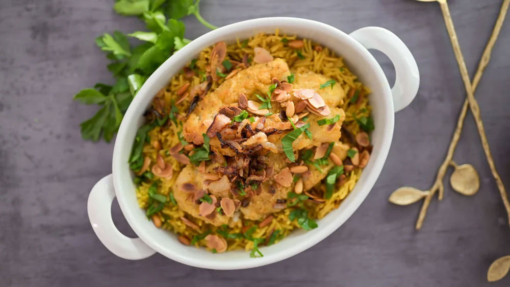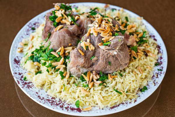 Braised lamb cooked in jameed yogurt sauce, Served over fragrant rice with pine nuts and crispy bread. Garnished with parsley and golden onions